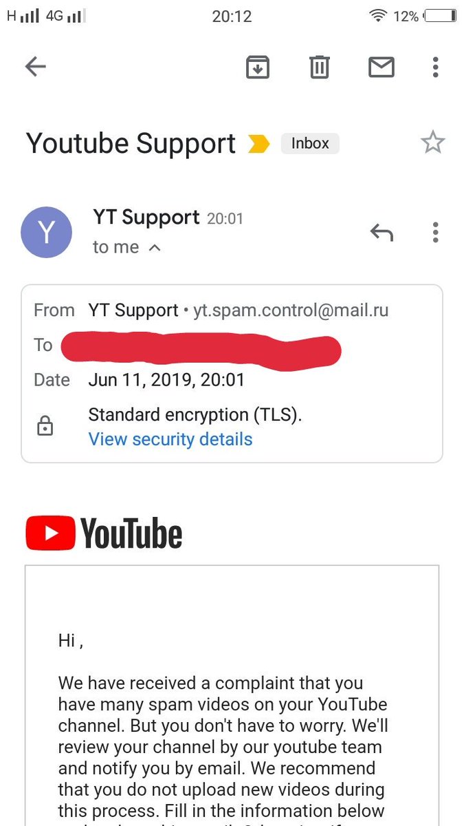 Appreciate the details. The email you've received isn't sent by our team. Please report this phishing email here: https://yt.be/help/RnGg . Note that YouTube will never ask for your personal info like passwords.