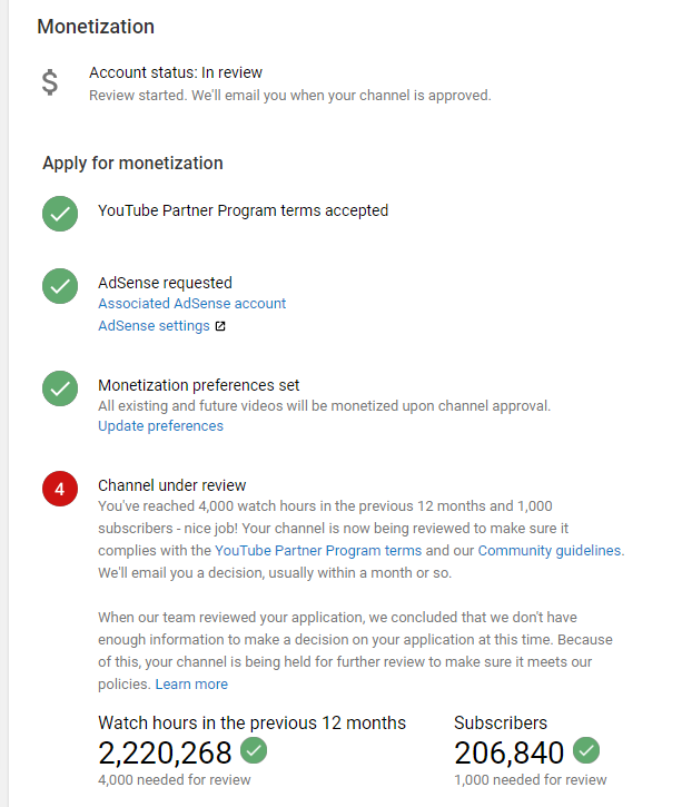 @TeamYouTube I've been waiting nearly 6 months. I understand you guys are busy but I feel like at this point my channel has been pushed aside for bigger channels. I see lots of channels getting their monetization back only after 1-2 months. I have attached the screenshot. Thankspic.twitter.com/SxlEXrZtCy