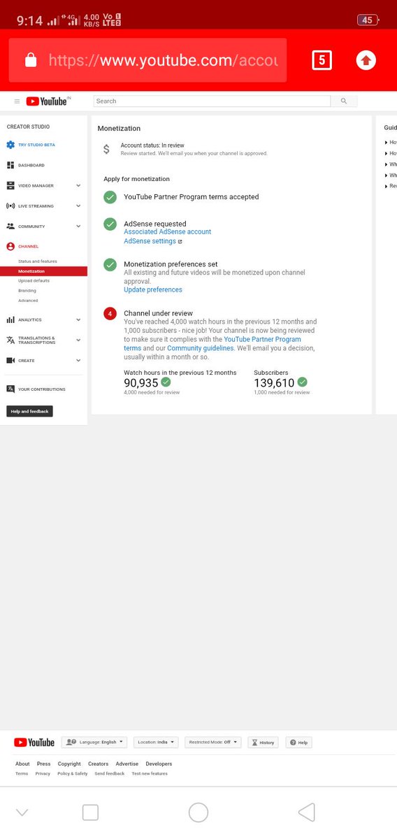 My channel is completed 1k subscribers and 4k watch hours in previous 365 days but my channel is still under review.