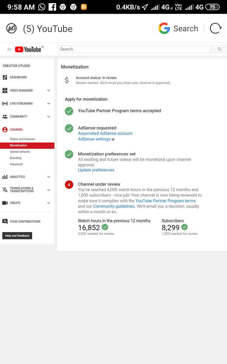 @TeamYouTube Dear Team YouTube I have already completed 4k hour watch time And 1k Subscriber In previous 365 Days and my channel is under review till 8 month.but monetization is not enable pls guide US.. presents watch time 16.8k h and 8.3k+subscriber https://www.youtube.com/channel/UC2X6E62TchN6uHzuNd7Arkw …pic.twitter.com/GLoLzmTwMC