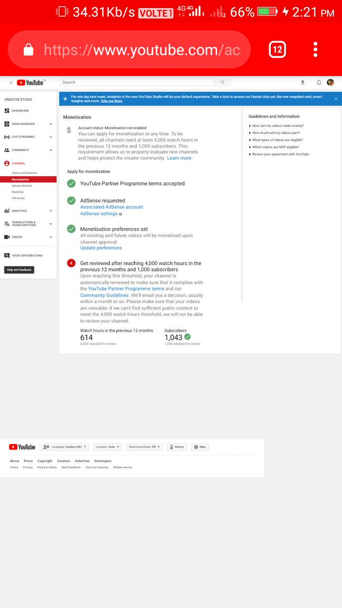 My Channel Completed 1000+ Subscriber But 4000 hours on my channel have not been completed But Completed 130k+ Views Sir I request For You Please Enable Monitazation.