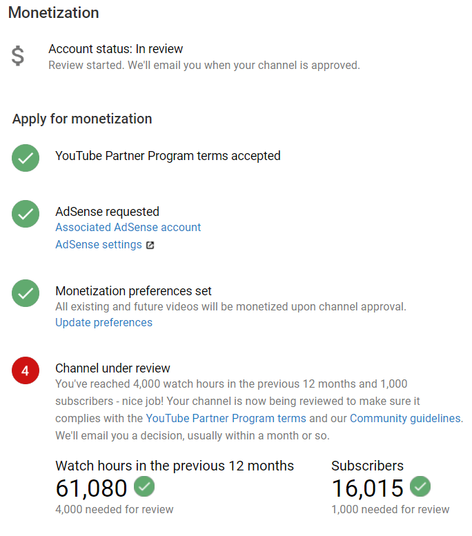 Thanks for reaching out. Looks like your channel is still in review. Our team is working hard by putting in extra efforts & resources to come to a conclusion about your application. Appreciate your continued patience with us.