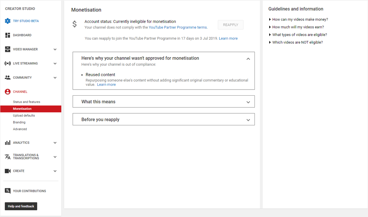Other channels same use content but after me and their monetization not disable, only me disable. Please check and help me. Thank You!pic.twitter.com/ulvfif0Nox