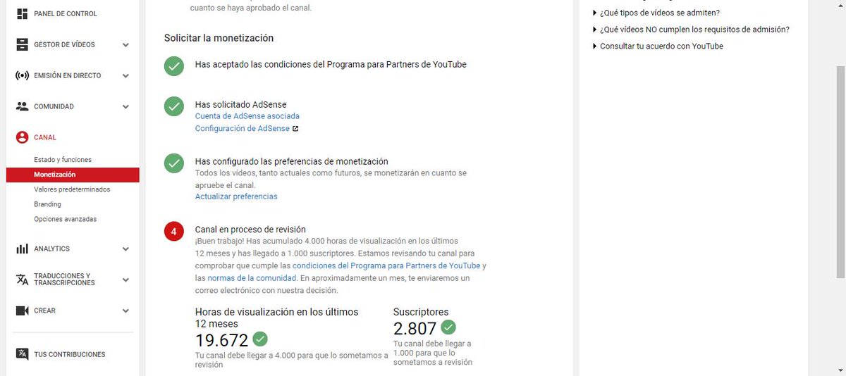 Hola. Nos gustaría poder ayudarte. Este proceso puede demorar más tiempo debido a que las solicitudes son revisadas por nuestro equipo de especialistas. En el siguiente enlace encontrarás más información acerca del proceso: http://yt.be/help/sjjY . Esperamos que sirva de ayuda.