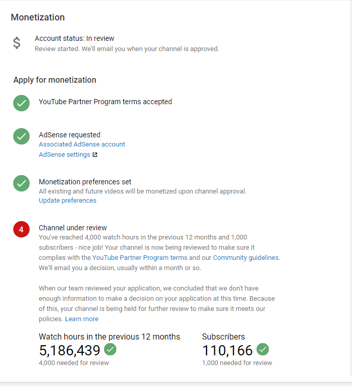 Thanks for the screenshot. Looks like your channel is still in review. We understand it's taking longer to process all the applications as we're reviewing every request manually. We're on track to roll out the final decisions. Hope you hear back soon.
