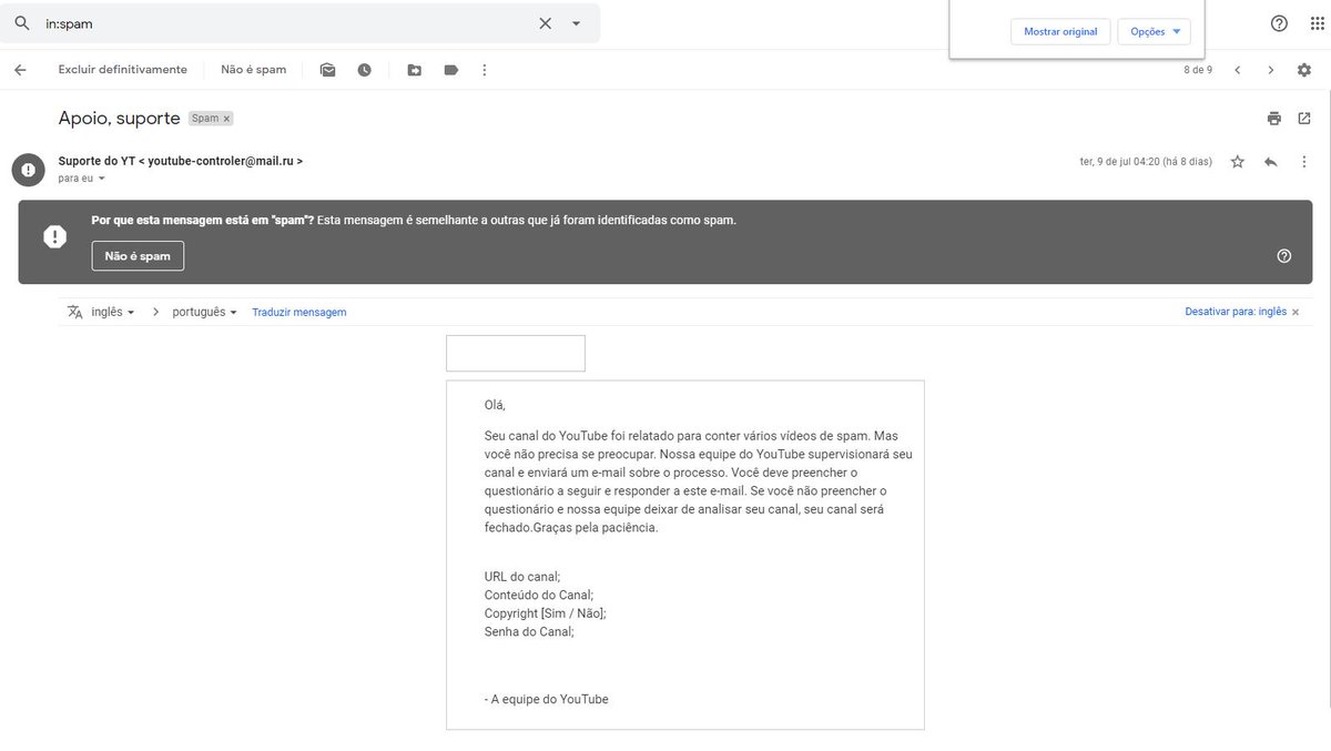 Tentem fechar esse domínio desse email, tentando scammar canais no YouTube, estava em inglês mas eu traduzi. @TeamYouTubepic.twitter.com/MXKyOO0dKJ