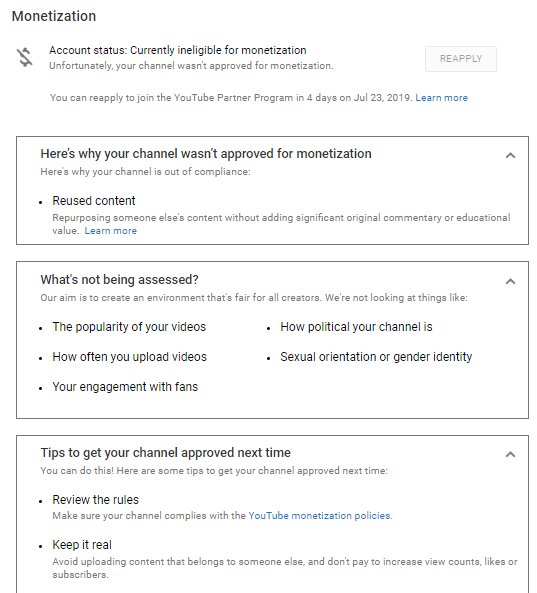 Thanks for the screenshot. To confirm, were you a part of YPP earlier and now demonetized, or is it the first time you've applied and were rejected? Let us know, we'll take a look.