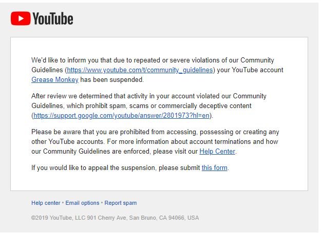My Youtube And Google Account (GreaseMonkey) Was Recently Suspended For No Valid Reason..