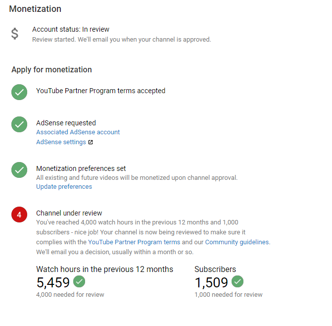 Thanks for reaching out. Mind sharing the screenshot of your channel's monetization page: https://yt.be/help/Gi28 ? Keep us posted.