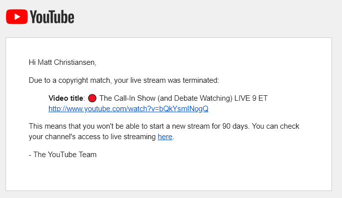 Yes, @TeamYouTube @YTCreators wrongly took down our stream tonight for playing roughly ONE MINUTE of the debate. Since YouTube doesn't give me a real person to talk to, all I have is Twitter shrieking. Help gaining their attention is much appreciated.