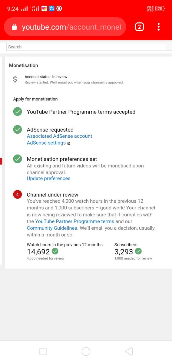 @TeamYouTube I have already completed 4000 hours watch time and 1000 subscriber in previous 365 days and my channel is under review in one month but monoetization is not enable please guide us. https://www.youtube.com/channel/UCzgH-jbN4Z8GSOD8z9V7Qnw …pic.twitter.com/v9c9G8fv36