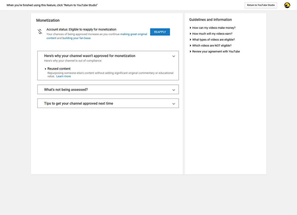 If you upload content from multiple sources, or reupload someone else’s existing content then you won’t be eligible for YPP. If you already made changes to your content, these are some best practices and you can re-apply in 30 days: https://yt.be/help/reused-content …