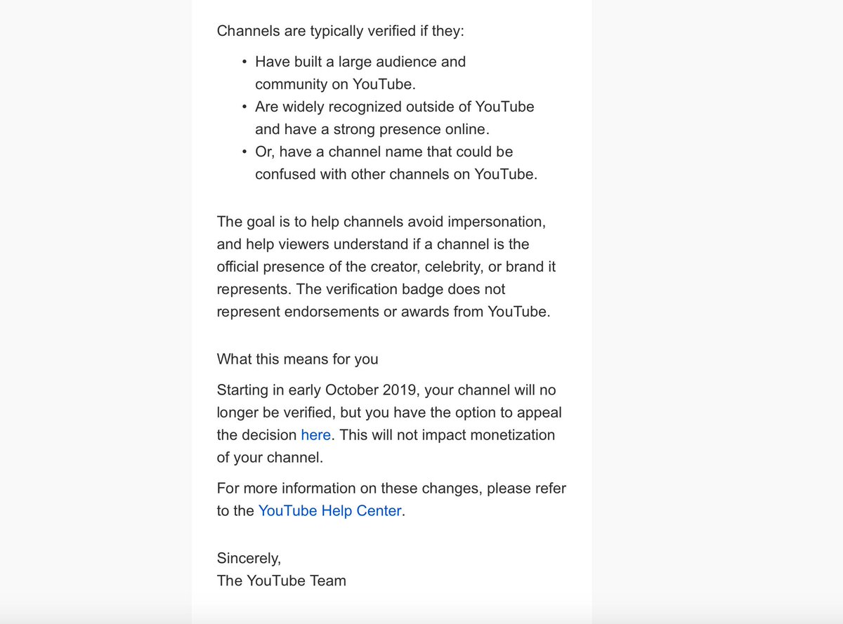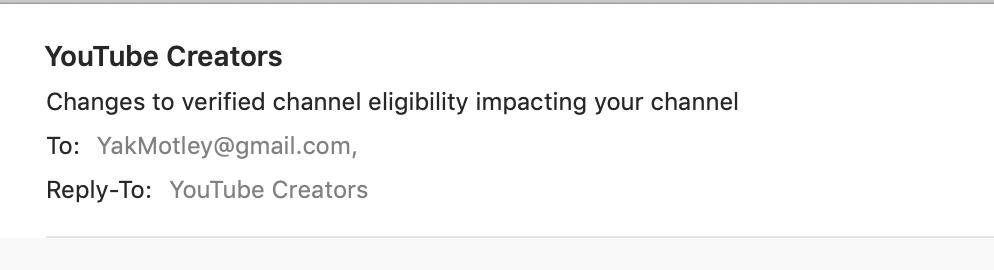 @YTCreators I just received this email. Is this real? I have been verified for a while and have 124k subscribers. What does this mean ? #youtube @YouTube @TheYTForum #help #verifymepic.twitter.com/m5Zc0GhD6X