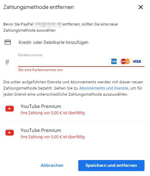 Wieso kann ich nicht einfach meine Zahlungsmethode entfernen? Ich will keine andere Zahlungsmethode hinzufügen. Zudem ich nicht mal YouTube Premium habe. Und wie können 0€ überfällig sein??????