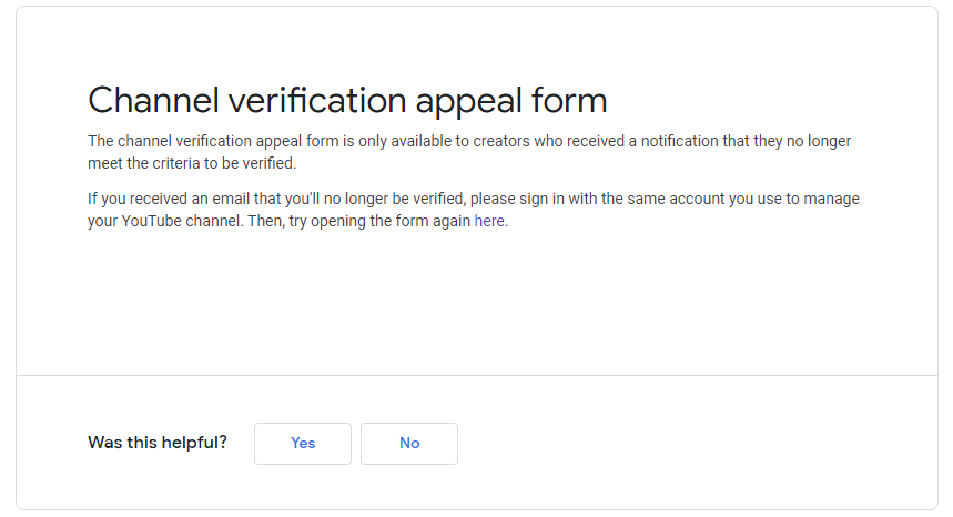 Humm, estranho. Poderia nos informar se é possível abrir o formulário indicado neste artigo da nossa Central de ajuda: https://yt.be/help/QtvS . Caso contrário, nos encaminhe uma captura de tela desde mesmo artigo. Iremos investigar.