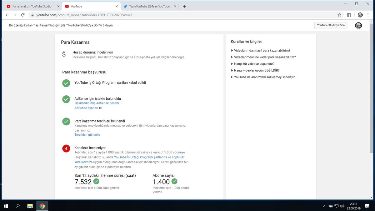 Hi teamyoutube. My channel's 1000 subscribers and 4000 hours of monitoring were completed months ago. But every time I send a message, I get the second review. Can my channel's monetization feature be checked? Have a nice day.@TeamYouTube Channel Link: http://youtube.com/c/ÖmerVarol pic.twitter.com/K3DoHpZLgz