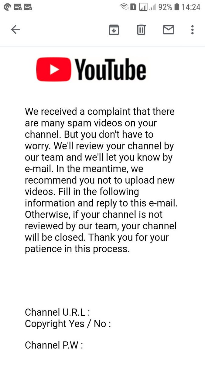 Esse foi o primeiro e-mail que recebi, tem outros até finalizarem o roubo se passando pelo YouTube. Não perdi minha conta Google, perdi somente meu canal do YouTube. Preciso de ajuda pra recuperar o canal.pic.twitter.com/ZjMvGXdSgT