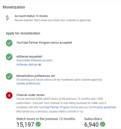 @YTCreators I have submitted my channel from six months ago but I have not received a monetization email from youtube . my channel has now reached 6800 subscribers and 15000 hrs watch time.please help me in this problem. channel url: https://bit.ly/2mu2Anc pic.twitter.com/LfQm9MOoRe