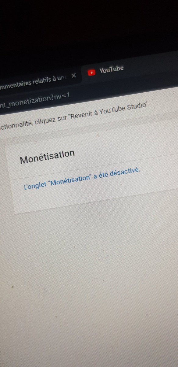 @TeamYouTube bonjour, j'ai la monétisation désactivé et quand je clique pour la réactivé il y a écrit "l'onglet "monétisation" a été désactivé.. que faire ? https://youtube.com/channel/UC_IsLLVh-9OLlxZq_vXchqQ …pic.twitter.com/NPCeoJj1Wx