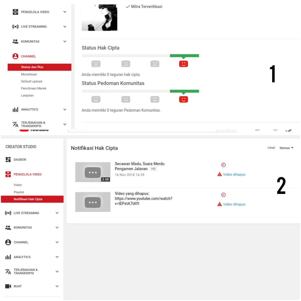 @TeamYouTube Please explain for pictures number one and number two: the first in the channel status and feature sections are not subject to copyright and community guideline status and the second in the video management section there are still copyright notifications thank youpic.twitter.com/C23MyGuUB2