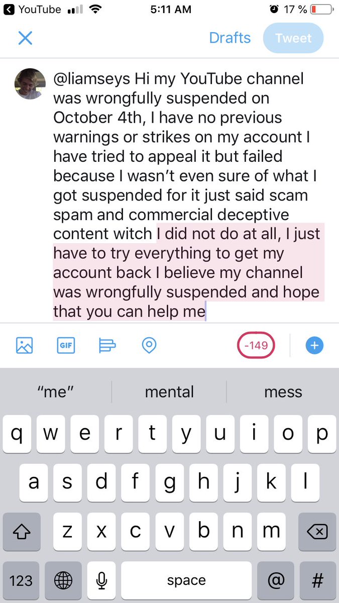 @TeamYouTube Hi my YouTube channel was wrongfully suspended on October 4th, I have no previous warnings or strikes on my account I have tried to appeal it but failed because I wasn’t even sure of what I got suspended for it just said scam spam and commercial deceptive contentpic.twitter.com/cCDyAFzyr4