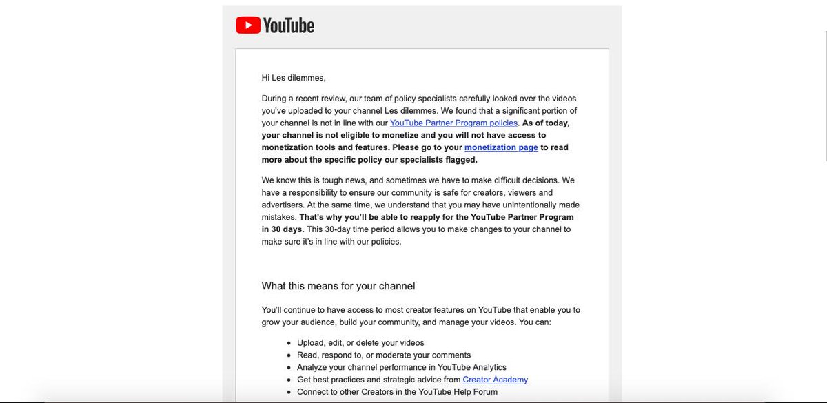 J'ai reçu un mail de la part de YouTube qui me retire mes droits à la monétisation de mes vidéos. Or toutes les vidéos postées sur ma chaîne sont toutes réalisées par mes soins ! J'aimerais connaître les détails de cette restriction ce qui met reproché.
