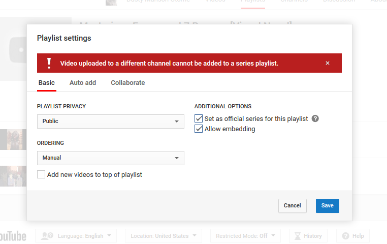 @TeamYouTube Suddenly I can't add my own videos to my playlists that are marked as series. The videos and the playlists are my own and both of them are on my own channel. This issue only happens with any of my playlists that I have marked as a series. This started 2 days agopic.twitter.com/zBI0vdqD6B