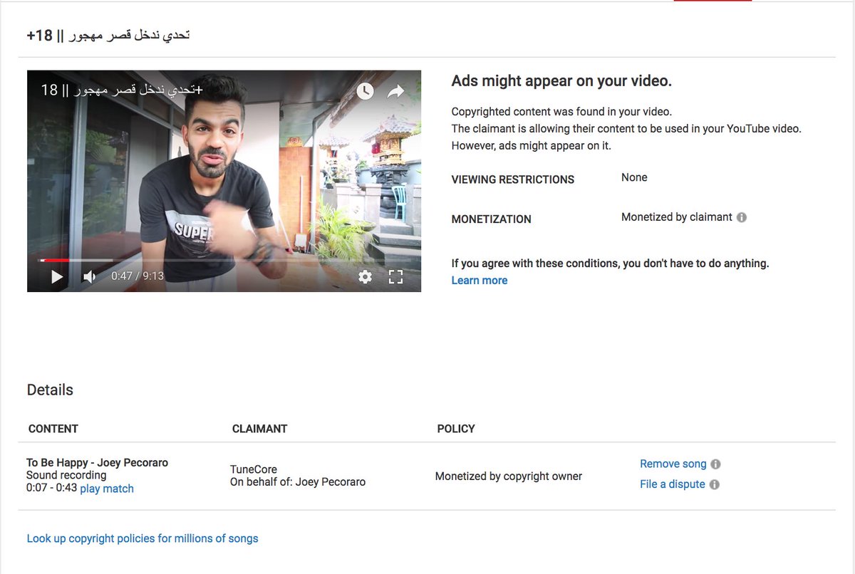 Hi @TeamYouTube , I just got now a copyright for using a song, on Feb 2017, and i uploaded with the right of using it that day. I don't know what's changed right now. they just taking the whole money from the video i worked days to make it, because of 40 seconds.pic.twitter.com/ZKCrs4BA3q