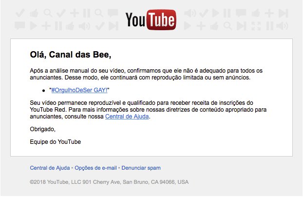 O youtube chama pra fazer uma série sobre ter orgulho de ser LGBT. Gravamos no @YouTubeSpaceSP e temos todo apoio do @YouTubeBrasil Passam uns meses e o conteúdo é desmonetizado. Depois de quase 8 meses uma analise manual chega a essa conclusão. Ta tudo certo mesmopic.twitter.com/MlmqH4Tk0q