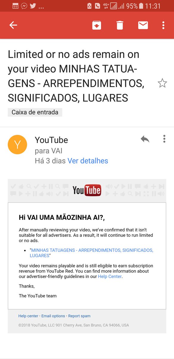Tá ai esse email sacana que vocês enviam quando analisam. Sem dizer o pq o conteúdo que passei horas fazendo, foi desmonetizado e não vou ganhar um real. Já vocês continuam lucrando com o conteúdo. Muito motivador, obrigada YouTube.pic.twitter.com/XKecF1P9Wp