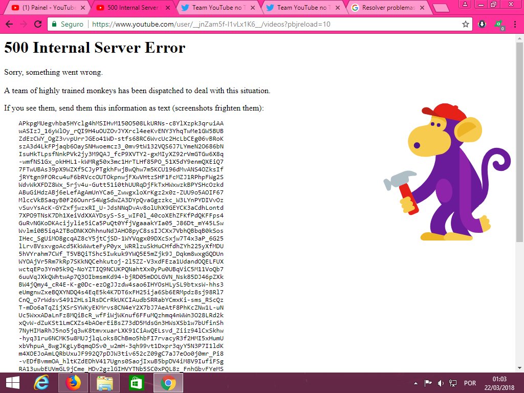 O #YouTube está com algum problema. Não consigo acessar a guia de vídeos do meu canal e também não consigo ver de alguns outros, mostra esse erro. ☹️Está assim já tem um tempo. Alguém sabe como ajudar? @TeamYouTube @YouTubeBrasilpic.twitter.com/0gUUlKRkPZ