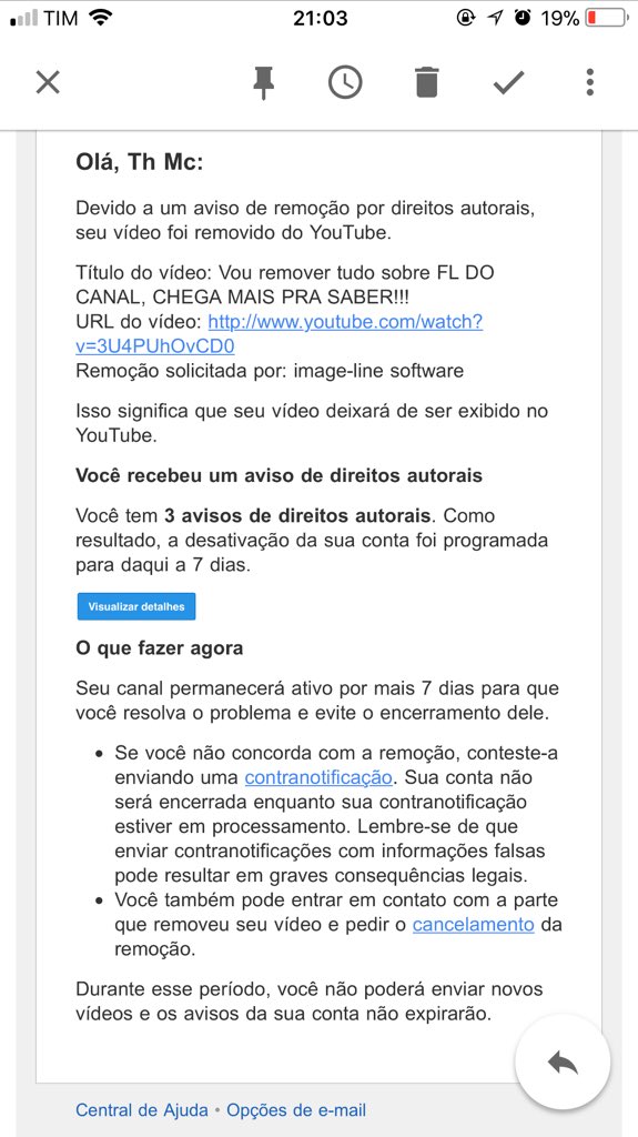 Então não tem motivo especifico só diz que foi solicitada a remoção pela @Image_Line porém dos videos removidos, 1 é sobre como remover ruido de audio e o outro é uma live que mencionei que removeria todos os videos relacionados a FL Studio do canal depois desse strike citado.