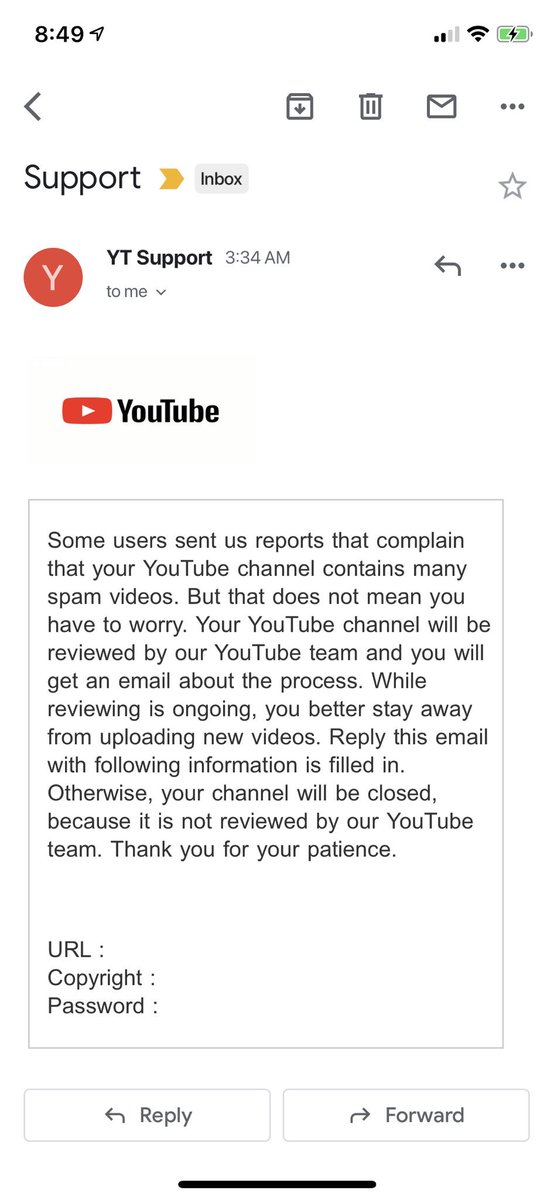 @YouTube @TeamYouTube This is the second SPAM email I received asking for my channel information.pic.twitter.com/wNW5nX2jug