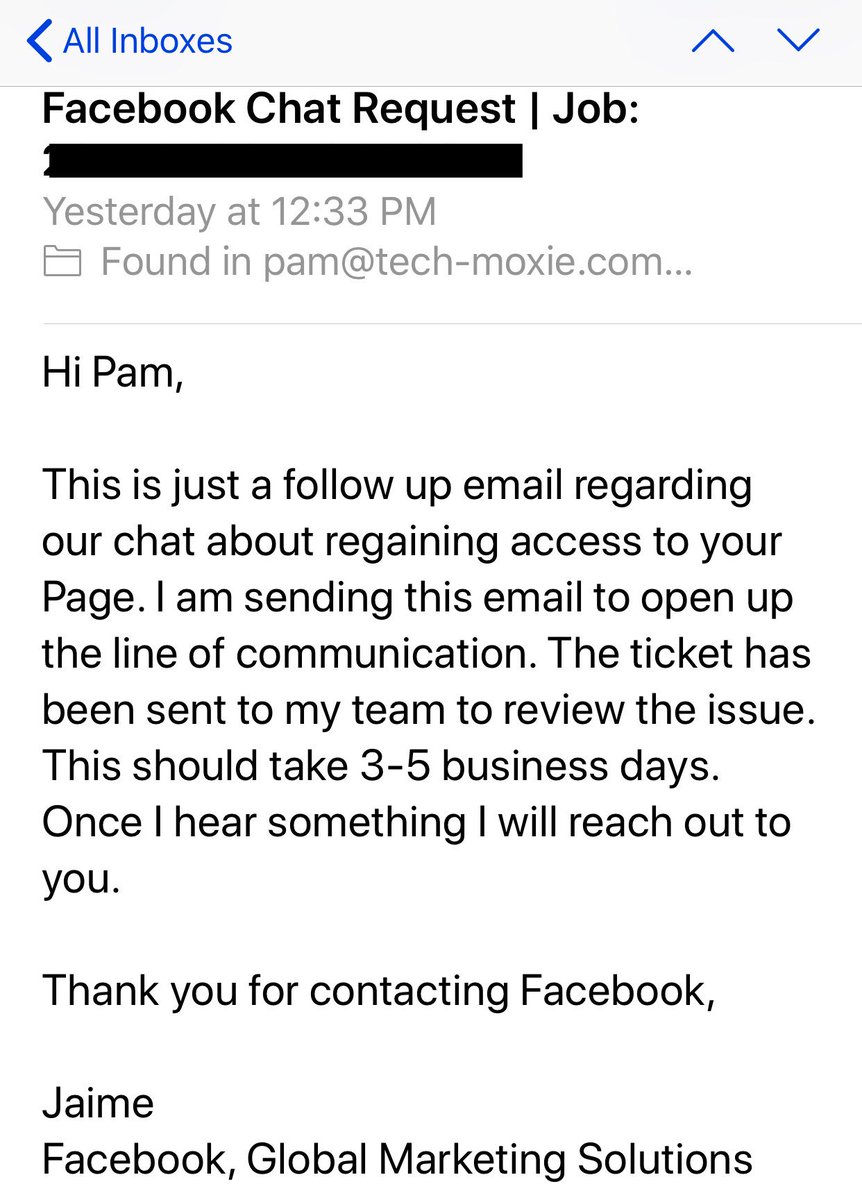 3. Finally got a support chat going with FB by using another page I manage. Person could do nothing but put in a request “to have team look at it.” Rec’d email to expect a respond in 3-5 business days. Request was made yesterday. With weekend that means outage possibly one week?!pic.twitter.com/FIrmIRtAPm