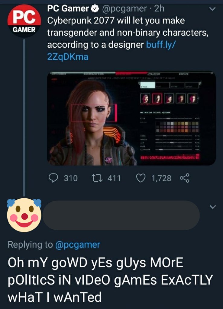 I mean cyberpunk pretty much just has a normal customization system. He's getting made fun of because there isn't much difference between this and other customization systems but he is trying to make it seem like the cyberpunk team is pushing an agenda.