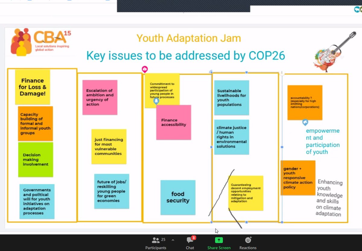 #Adptation Jam’ at#CBA15 we’re populating an interactive jamboard with ideas & solutions from young individuals & youth organisations to take to#COP26. How can youth involved in the adaptation processes – what do they need to get there?@gayoghana@IIEDpic.twitter.com/HS5yC5s5vO