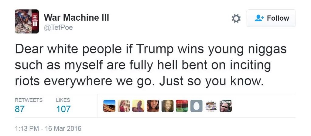 @TefPoe Dear black people if Hillary wins young whites such as myself are going to work the next day. Just so you know. - 1 more reply