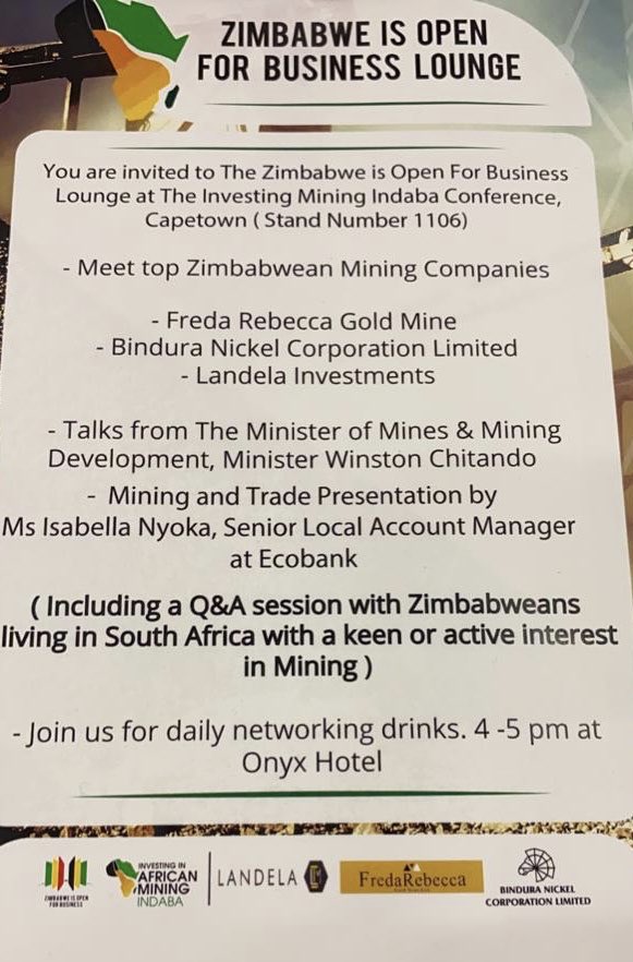 2/ Tonight Onyx Hotel plays host to the Minister of Mines, Hon. Chitando & all registered with the Mining Indaba with interest in Zimbabwe are welcome to join.