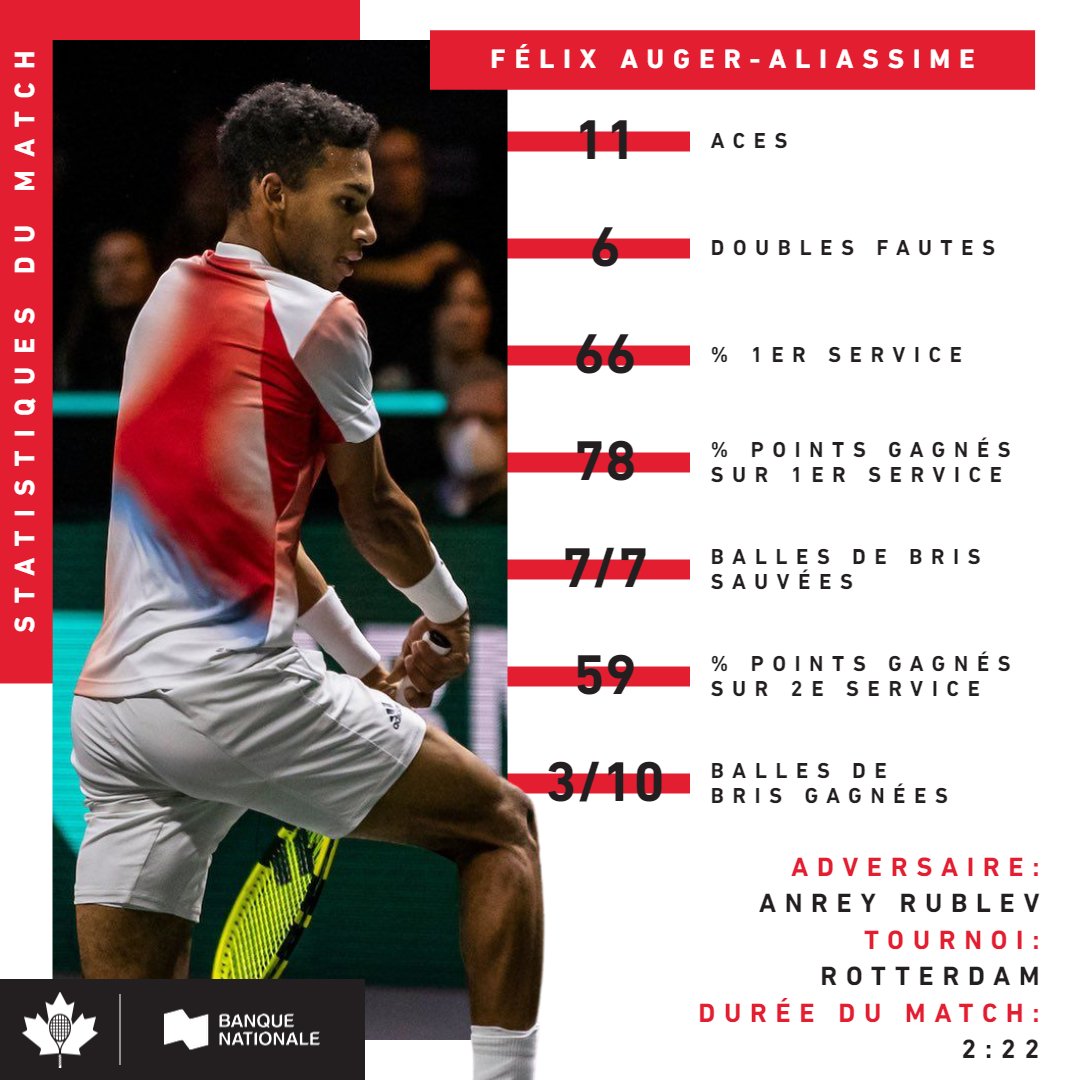 Félix a élevé son niveau au fur et à mesure de son match de demi-finale contre Andrey Rublev, tête de série n°2. Sans rien lâcher sur son propre service, Auger-Aliassime s'est imposé en se qualifiant pour la finale de Rotterdam.