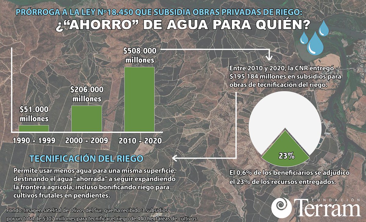 La prórroga permitirá que por 12 años más, quienes se benefician de subsidios @CNRCHILE puedan destinar el agua “ahorrada” a seguir expandiendo sus cultivos, afectando aún más los ecosistemas de la zona central, profundizando la#desertificación.pic.twitter.com/g1vr9KzZcu