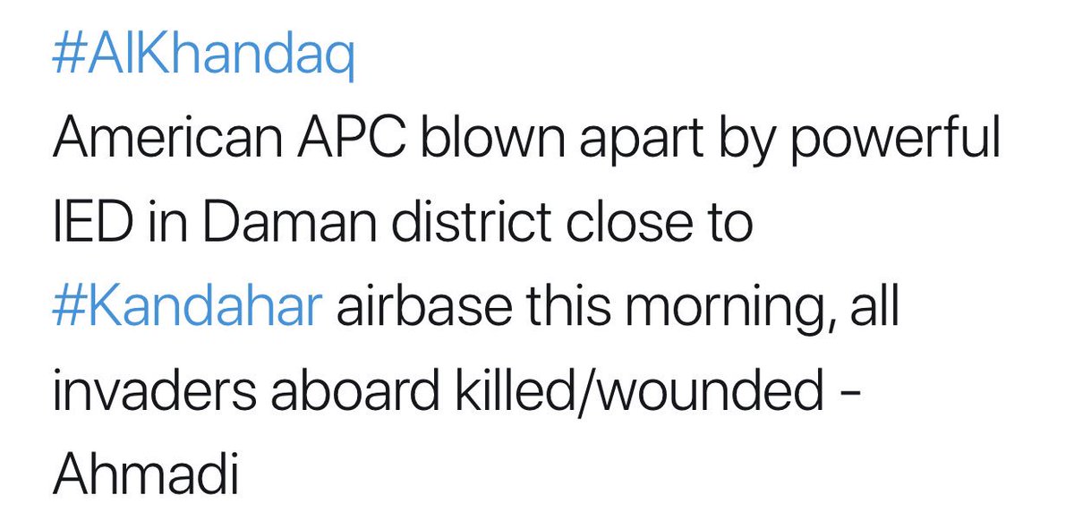 #Taliban Claims IED Attack On #US Army #APC In Daman District Near #Kandahar Airbase. #TerrorMonitorpic.twitter.com/ZEabUSmd5G