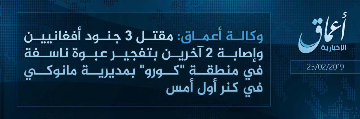 #AFGHANISTAN #IslamicState Claims Killing 3 Soldiers & Wounding 2 In #Kunar. #TerrorMonitorpic.twitter.com/MaUqCjxfEC