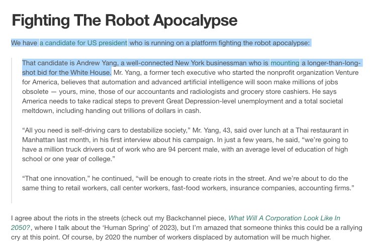 We have a candidate for US president who is running on a platform fighting the robot apocalypse: That candidate is Andrew Yang, a well-connected New York businessman who is mounting a longer-than-long-shot bid for the White House. http://workfutures.org/post/178005574463/fighting-the-robot-apocalypse … pic.twitter.com/Hvc6csg2bG