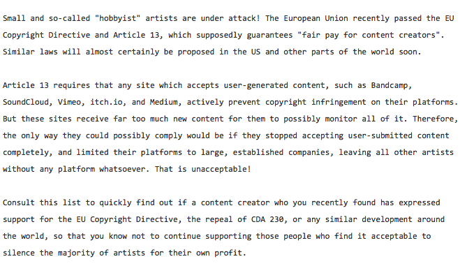 Incredible. A stellar example of fear mongering and turning facts upside down, while attacking artists who don't want to go belly up. All to help robber barons make even more money on the back of the small guy. Honored that my name is on the list. https://buff.ly/2NrbMp5 pic.twitter.com/i9aYb7sGcN