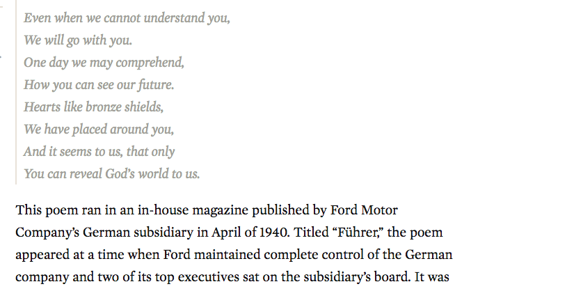 "The Ford family and company executives in Dearborn repeatedly congratulated the management of Ford Werke on the fine work they were doing under the Nazis." https://www.thenation.com/article/archive/ford-and-fuhrer/ …pic.twitter.com/ZtPzB2YV5b
