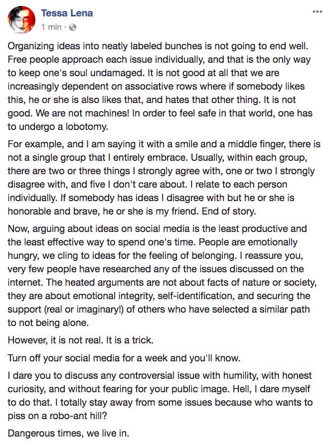 Artist. Writer. Philosopher. Politics: HUMAN \\ Writing http://tessafightsrobots.com  \\ Music http://tessamakeslove.com  #MakeLanguageGreatAgain #PsychoEconomy