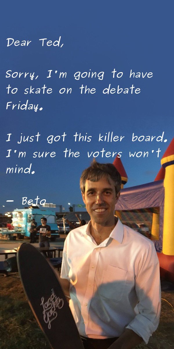 Beto's a real Texan & will probably be watching some high school football under the Friday night lights. Meanwhile it gives R. Ted Cruz time to "research" Obama speeches to find better source material than his "soft, weak" lies