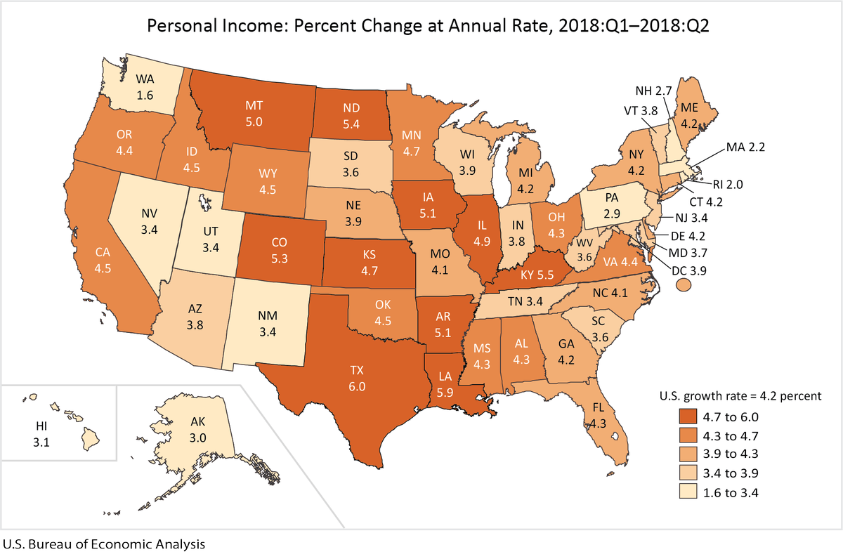 Texas led the nation with the largest increase in personal income during the second quarter of 2018. https://www.bea.gov/news/2018/state-quarterly-personal-income-2nd-quarter-2018 … pic.twitter.com/Jj0Bi5kS08