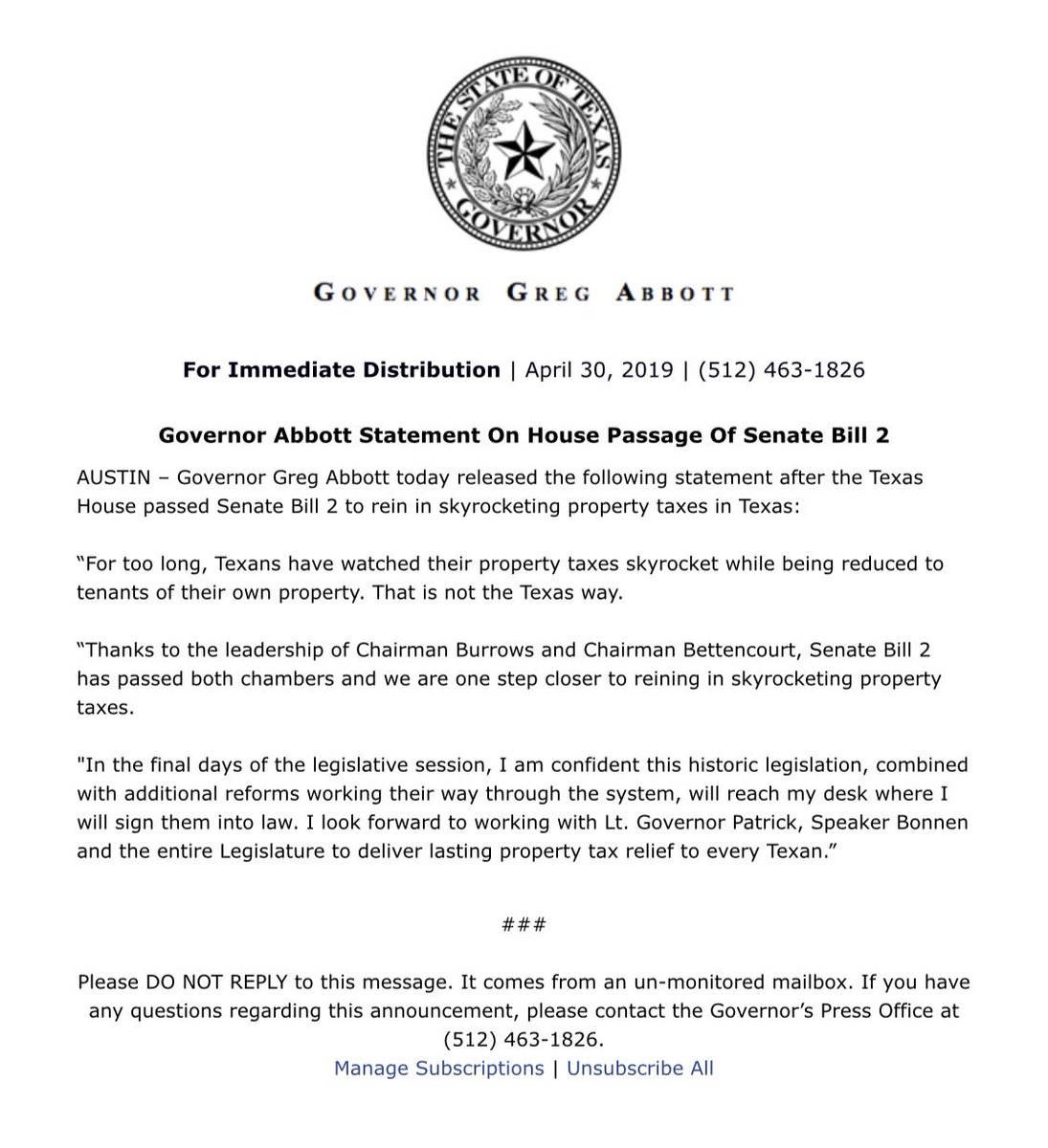 Statement on passage of SB 2, the property tax reform bill. #txlege pic.twitter.com/Pwmb5EUXbA