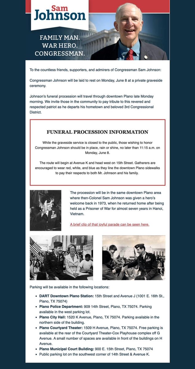 The Plano community is invited to pay tribute to Congressman Sam Johnson by lining the Funeral Procession route no later than 11:15 am on Monday, June 8th.pic.twitter.com/tXvaHHfaml